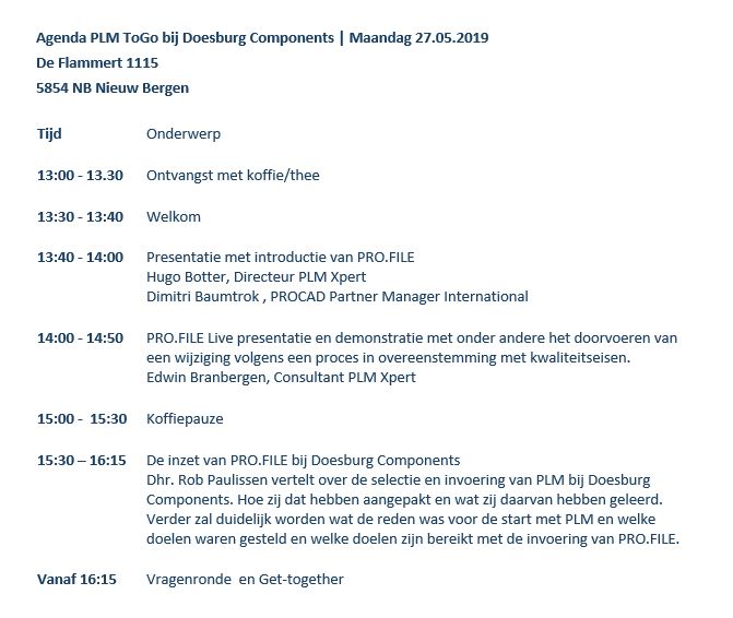 Welke oplossing is het meest geschikt voor mij? Is dit systeem flexibel genoeg om mee te groeien en te veranderen? Kan ik mijn CAD-modellen, tekeningen en stuklijsten evenals mijn project- en bedrijfsdocumenten in zo'n systeem beheren? Hoe zit met toepassingen zoals kwaliteitsprocessen en de aansluiting op ERP? Hoe doe je dat dan? Hoe pak je zo iets aan? Onze PLM ToGo levert u waardevolle informatie tijdens uw oriëntatietraject. Ervaar in de praktijk hoe het gastbedrijf de stap naar PRO.FILE al heeft genomen en succesvol doelen realiseert. Op 27 mei 2019 zijn we te gast bij Doesburg Components te Nieuw Bergen.