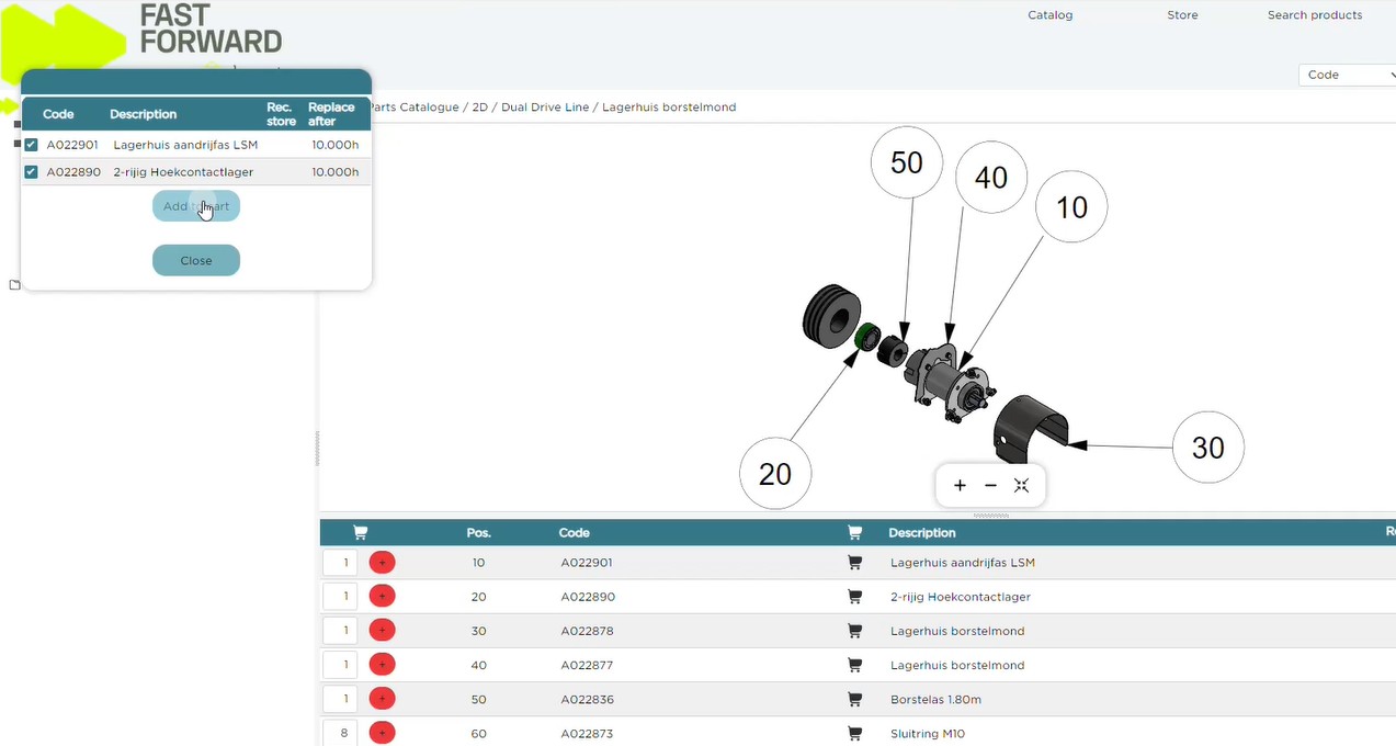 Deze slimme digitaliseringsoplossing is als stand-alone toe te passen en is uitgerust met alle functionaliteiten die nodig zijn om elektronische onderdelencatalogi te maken van de producten die u ontwerpt en levert. Het kan daarmee voldoen aan de vereisten van maakindustrie bedrijven, zowel bij seriematige productie als klantspecifieke producten. De Spare Parts Portal helpt bij het opbouwen van klantloyaliteit met een snelle levering van onderdelenbestellingen en een hoogwaardige aftersales service. De onmisbare tool voor uw Service Team, Dealers, Onderhoudstechnici, After Sales.