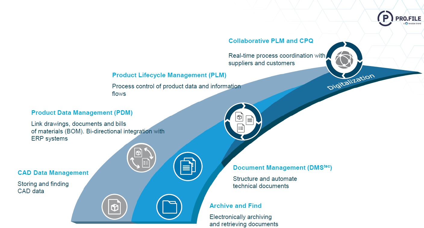 Wat zijn uw doelen? Meer efficiency? Kortere doorlooptijden? Meer inzicht in uw processen en projecten zodat tijdig bijsturen mogelijk is? Ieder bedrijf actief in de maakindustrie is vandaag de dag bezig met Product Data- en Lifecycle Management, of u het nu zo noemt of niet. Vanaf het eerste prototype tot aan service en spare-part beheer, uw product data doorloopt verschillende stadia en processen, ondersteund door verschillende IT-systemen. Met PRO.FILE kunt u stap voor stap van CAD-datamanagement naar een end-to-end PLM-oplossing. Eén Product Data Backbone voor al uw productgegevens en documenten.